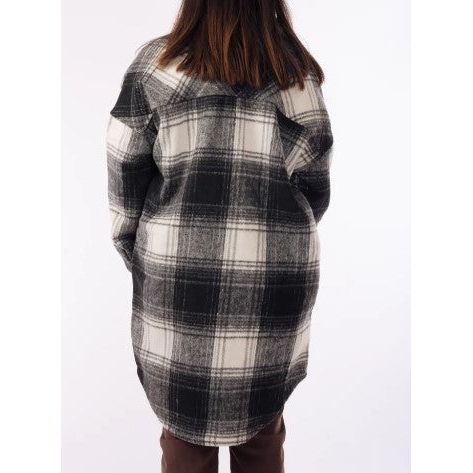 Ladies Brush Plaid Long Shirt Style Shacket - Black